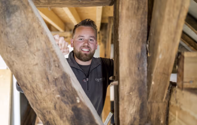 Het mooiste aan zijn werk? “Van niets iets maken, dat is toch het mooiste wat er is. Er is niet een onderdeel dat eruit springt, het is het complete werk. Dat we vanuit de wens van onze klant iets concreets opbouwen. Natuurlijk houd ik nog steeds van het ambachtelijke timmerwerk. Maar ook van het regelen, de communicatie, het uitwerken. En we komen overal! Dat is geweldig.” Jan Herm vertelt dat De Moete Bouw sinds 2023 officieel een erkend SBB-leerbedrijf is. “Samen met Jos wil ik onze kennis en ervaring als leermeester doorgeven aan de volgende generatie. En vooral: de liefde voor het vak. Dat kost veel tijd, maar is de energie meer dan waard.”