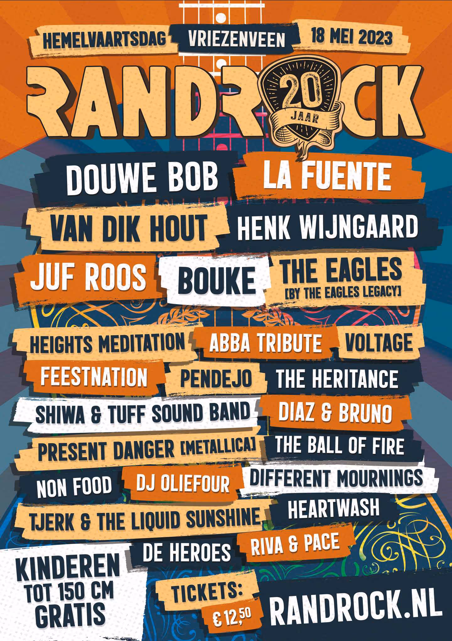 iefhebbers van goede muziek en gezelligheid kunnen op Hemelvaartsdag -donderdag 18 mei- terecht bij Randrock Vriezenveen. Met een vol programma op Randrock, Randrock Junior, Randrock Food & Reggae Lounge, Randrock Dance en nieuw dit jaar: Randrock Metalmiddag wordt het een feest om nooit te vergeten. Het centrum van Vriezenveen is het grote festivalterrein waar tussen 13.00 en 1.00 uur voor jong en oud van alles te beleven is. En het is dit jaar extra feest, want Randrock bestaat 20 jaar!