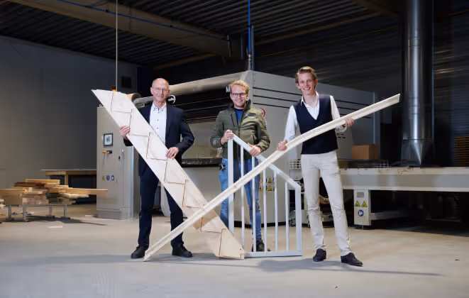 “We zijn hier met Synwood Trappen gestart in 2016”, zegt Johan. “Maar de geschiedenis gaat eigenlijk meer dan honderd jaar terug. Toen is een fabriek in Marum opgericht - aanvankelijk onder de naam De Volharding. Die fabriek kwam in 1981 in handen van mijn vader, en later van mijn broer Wim. Toen de crisis kwam, leek het einde nabij. Maar in 2016 besloten Gertjan en ik om te proberen het bedrijf nieuw leven in te blazen onder de naam Synwood Design.” Gertjan vult aan: “Na zo’n vijfeneenhalf jaar in Marum bezig te zijn geweest, bekroop ons steeds meer het gevoel dat we moesten verhuizen naar Rijssen, onze thuisbasis. Dat gevoel werd werkelijkheid en zie hier het resultaat. Het was een goede beslissing. De nieuwe fabriek draait op volle toeren, de orderportefeuille is goed gevuld en we hebben voldoende capaciteit om nog verder te groeien.”