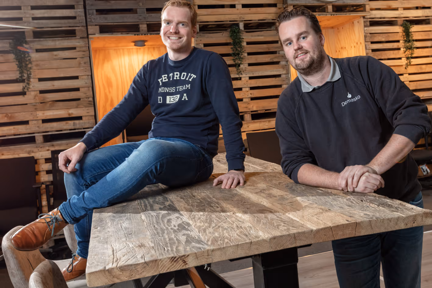 “Hoe we aan onze klanten kwamen? Gewoon; deuren in schoppen. Hier zijn wij, Jorno Masselink en Thomas Koopman van Demasko. Dat hebben we de eerste twee jaar gedaan. Daarna ging het eigenlijk bijna vanzelf”, gaat Thomas verder. “Trouwens; onze eerste klant was onze accountant. Toen we hem vroegen of hij dat voor ons wilde doen, zei hij: ‘ja, maar dan wil ik wel dat je me vier verstelbare bureaus levert’. Vergeten we nooit meer.” Jorno: “Na die twee jaar kwamen klanten met name door mond-tot-mondreclame en via onze website. Ons afzetgebied, als ik het zo mag noemen, verbreedde zich van Twente via de Stedendriehoek, dus Apeldoorn, Deventer en Zutphen, naar Amsterdam en zelfs Venlo.” Thomas: “We doen wat we zeggen en dat zingt zich rond. Als we dinsdag over drie weken om acht uur afspreken, dan staan wij er ook. Dat schijnt in het westen des lands nog wel eens bijzonder te zijn.”