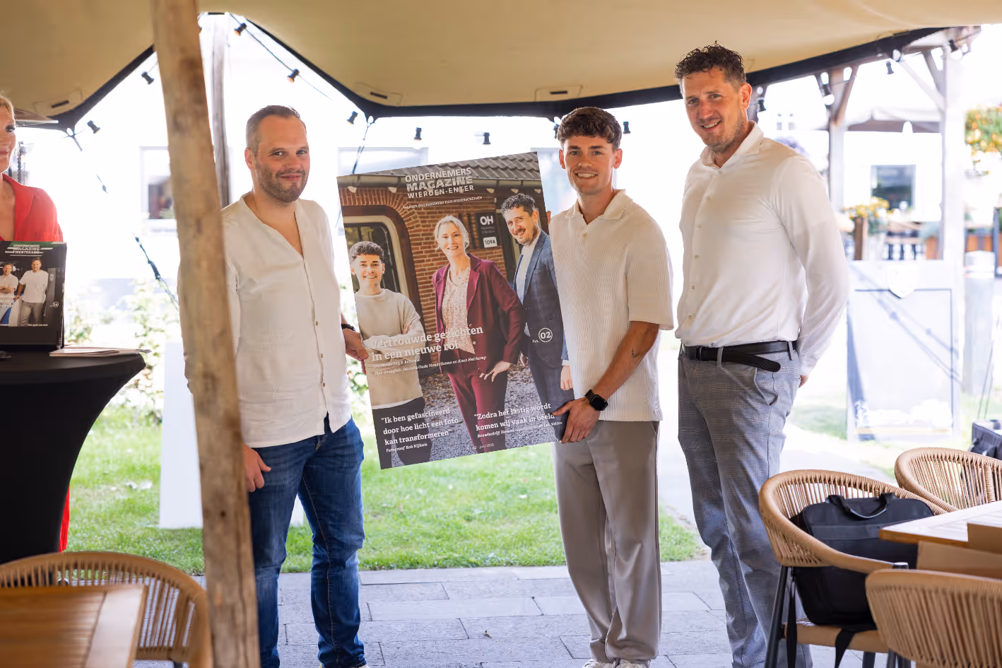 Daarna kwamen twee van de drie ondernemers die de cover van de versie Wierden-Enter aan het woord, namelijk Koen Heitkamp en Dirk Bruggink die onder meer vertelden hoe zij de dagelijkse leiding over hun bedrijf OH Marketing & Reclame vanaf begin dit jaar hebben overgenomen van Jolanda Oude Hendrikman. Zij kregen van de bedenker van de magazines, Jouke Zomer, als herinnering een groot bord met de afbeelding van de cover. Dat bord stond ook gereed voor de covergasten van Ondernemersmagazine Twenterand, Tom en Bas Lempsink, maar zij konden helaas niet aanwezig zijn. Wel aanwezig was Martijn Gerritsen van De Haar Automotive, die de presentatie van Ondernemersmagazine Rijssen-Holten aan zich voorbij moest laten gaan. Hij beantwoordde vragen van Astrid onder andere over de rebranding van het bedrijf en de bedrijfscultuur, die is gestoeld op het authentieke menselijke aspect: niet gaan blazen, maar in de praktijk brengen wat je belooft.